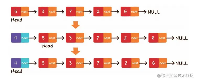 头部插入,分为两个步骤:1、把新节点的next指针指向原先的头节点,2、把新节点变为链表的头节点