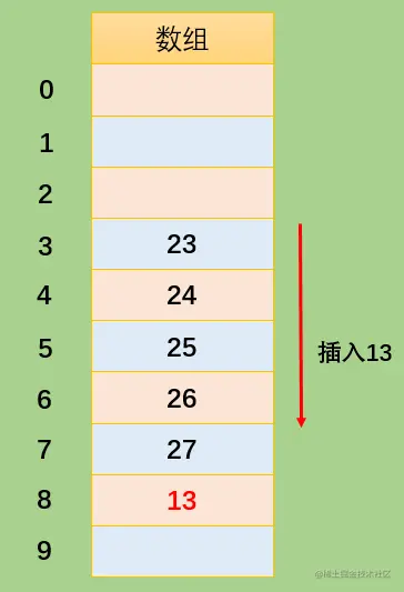 经过哈希化(对 10 取余)之后得到的下标值 index=3,但是该位置已经放置了数据 33。而线性探测就是从 index 位置+1 开始向后一个一个来查找合适的位置来放置 13,所谓合适的位置指的是空的位置,如上图中 index=4 的位置就是合适的位置。
