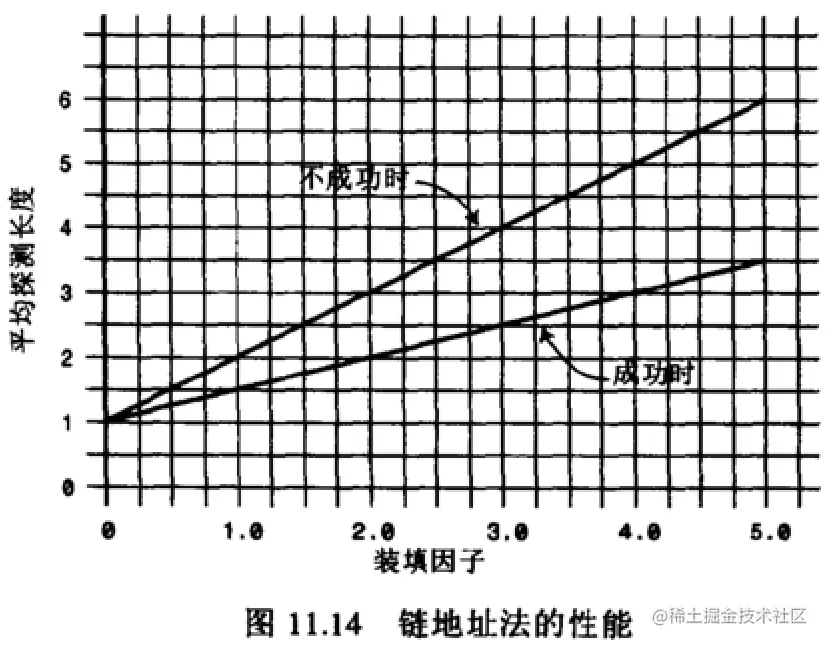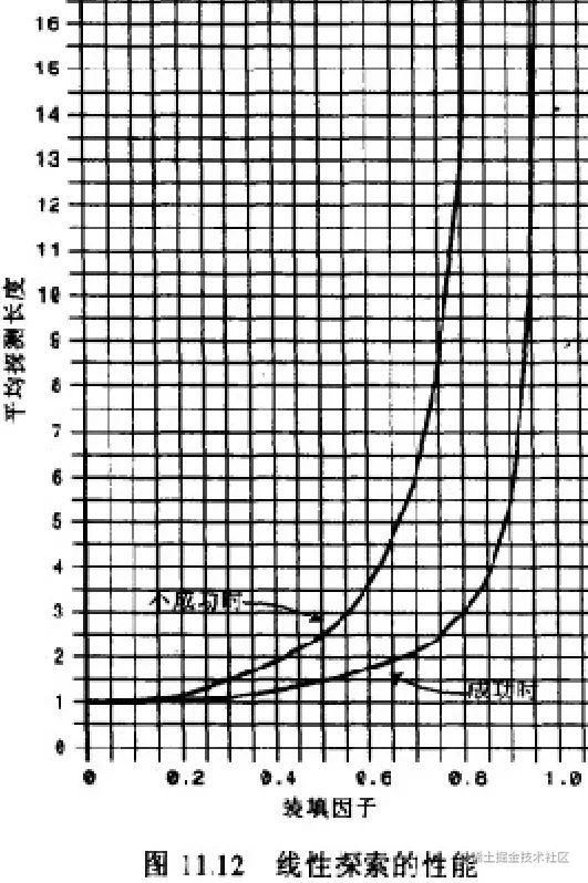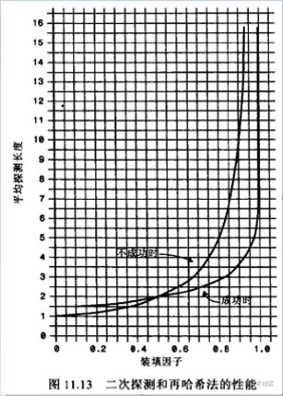- 二次探测和再哈希化的性能: 二次探测和再哈希法性能相当,它们的性能比线性探测略好。由下图可知,随着装填因子的变大,平均探测长度呈指数形式增长,需要探测的次数也呈指数形式增长,性能不高。