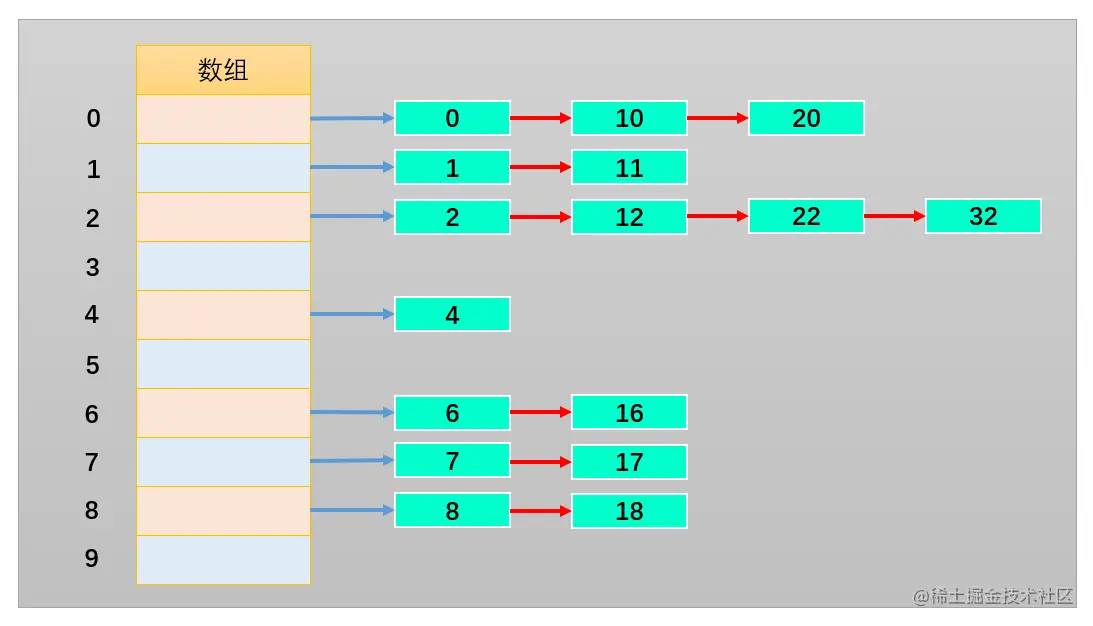 如下图所示,我们将每一个数字都对10进行取余操作,则余数的范围0~9作为数组的下标值。并且,数组每一个下标值对应的位置存储的不再是一个数字了,而是存储由经过取余操作后得到相同余数的数字组成的数组或链表。