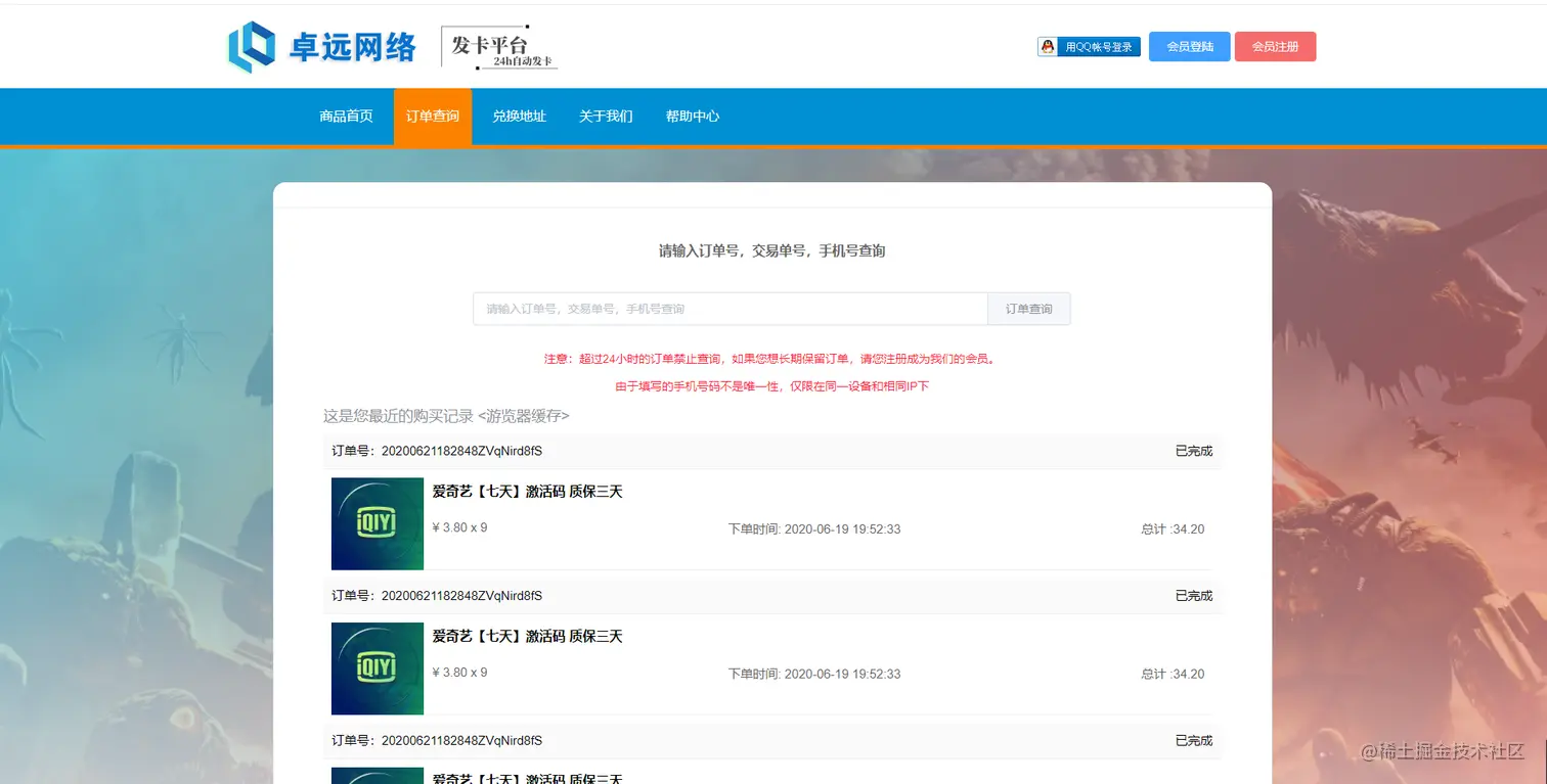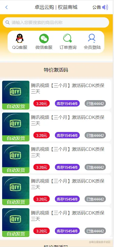 跳蚤云虚拟发卡 一个爱学习的小伙子 2020-08-25 143 阅读1分钟 由于开发时间比较有限,刚好就去上班了 后面就没有太多的时间做后端部分,目前完善了,前端页面 代码仓库(前端):gitee.com/Sir-luo/fle… 部署地址(移动端+PC): faka.fengbooks.club 移动端: 下面是部分截图: