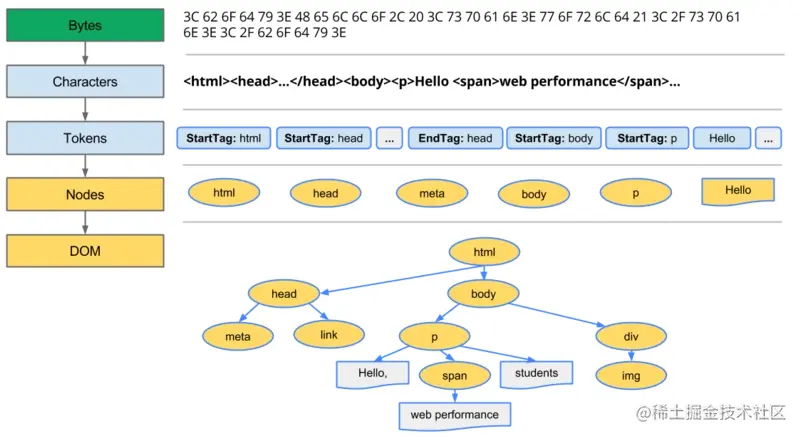2.按照W3C规则进行字符解析,生成对应的Tokens,最后转换为浏览器内核可以识别渲染的DOM节点