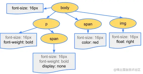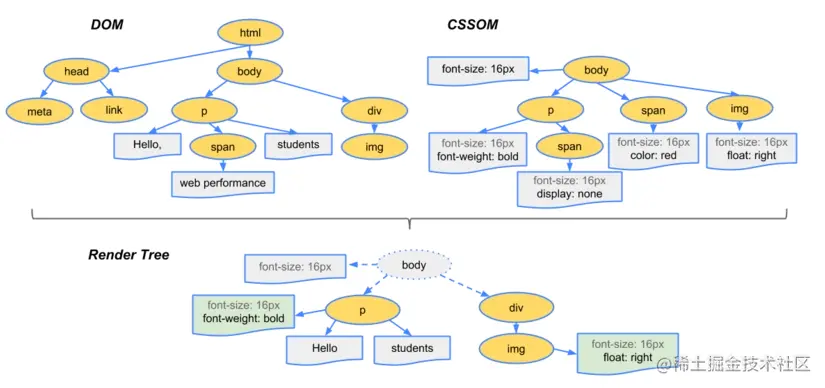 ②构建CSSOM树:当所有的CSS请求回来之后,浏览器按照CSS的导入顺序依次进行渲染,最后生成CSSOM树