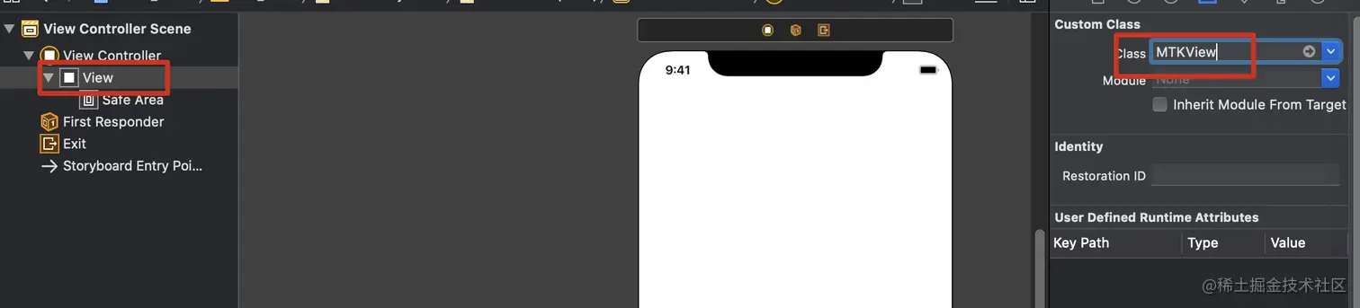 我们直接将storyboard中的view的类型改为MTKView。使得在控制器带初始化的时候,自动为我们创建一个MTKView,供我们使用。