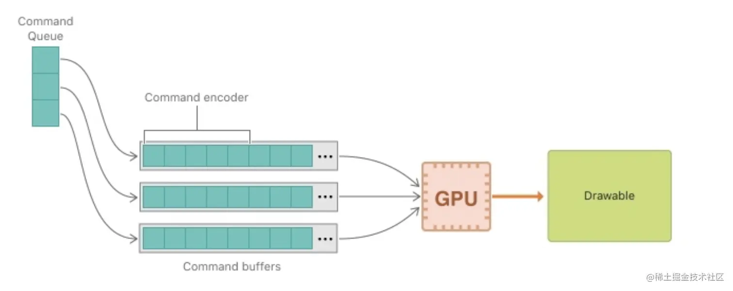 为当前渲染的每个渲染传递创建一个新的命令缓冲区。使用MTLCommandQueue创建对象并且加入到MTCommandBuffer对象中去。