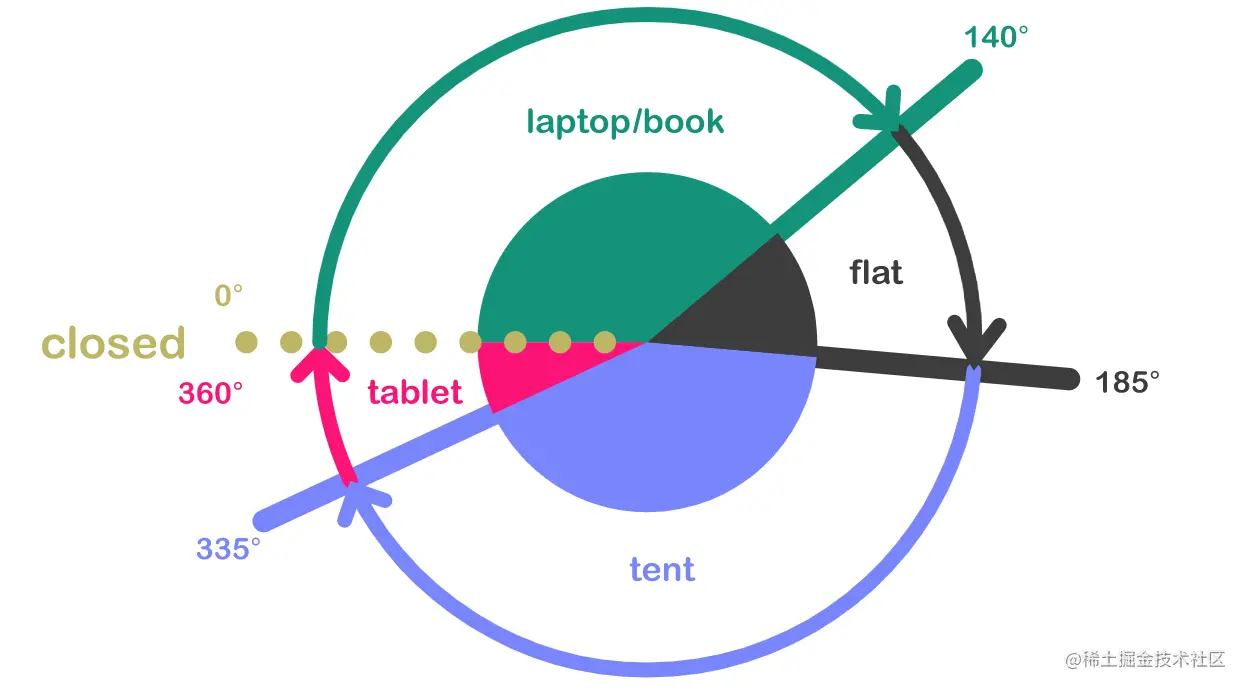 该API允许Web应用程序请求将具有屏幕铰链的设备折叠到的角度值。 在适当的条件下(如果允许),将返回表示角度(以度为单位)的值。