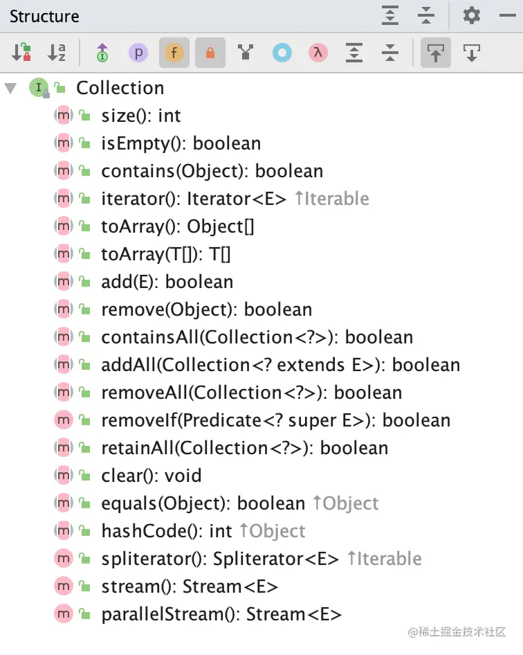 Collection 接口就是Java中所说的多态的一种实现,它只给出了一些集合需要用到的方法,自己不提供实现,由具体的实现子类去实现,如下图,都是Collection定义的方法,