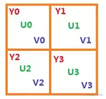 - Y分量每个像素采样,U,V分量每两个像素采一次样,第一个像素的U,V分量的值用在第0个像素处采样的U0,VO的值;第三个像素的U,V分量的值用在第2个元素处采样的U1,V1的值。