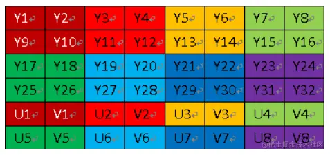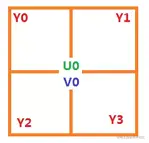 - 对于每个2x2像素块,对于每个像素Y分量采样,整个2x2块中分别对U和V分量只做一次采样.