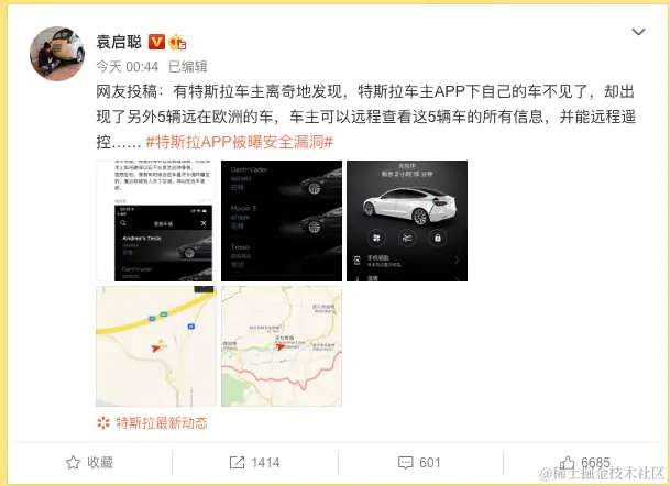 先思考一个问题,电动车特斯拉的安全隐患有哪些?可能大部分人最先想到电池起火。电池起火固然可怕,但车上人员至少还有撤离的时间,但如果车辆在行驶中被黑客控制,那车内的乘客就真的是“人为刀俎,我为鱼肉”了。前不久就有位特斯拉车主在微博报料,某日他在查看自己的特斯拉手机应用时,突然发现自己的车辆信息不见了,却出现了另外五辆远在欧洲的车,令人迷惑。同时,他还能通过应用远程操控这些车辆。对此,该车主将情况反馈给了特斯拉方面,而特斯拉方面直到第二天才进行修复。