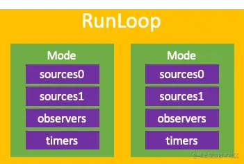 - 一个RunLoop包含若干个Mode,每个Mode又包含若干个Source0/Source1/Timer/Observer