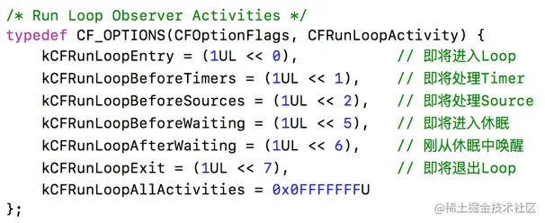 CFRunLoopObserverRef observer = CFRunLoopObserverCreateWithHandler(kCFAllocatorDefault, kCFRunLoopAllActivities, YES, 0, ^(CFRunLoopObserverRef observer, CFRunLoopActivity activity) {