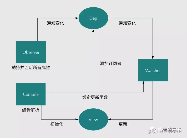 我们已经知道实现数据的双向绑定,首先要对数据进行劫持监听,所以我们需要设置一个监听器Observer,用来监听所有属性。如果属性发上变化了,就需要告诉订阅者Watcher看是否需要更新。因为订阅者是有很多个,所以我们需要有一个消息订阅器Dep来专门收集这些订阅者,然后在监听器Observer和订阅者Watcher之间进行统一管理的。接着,我们还需要有一个指令解析器Compile,对每个节点元素进行扫描和解析,将相关指令对应初始化成一个订阅者Watcher,并替换模板数据或者绑定相应的函数,此时当订阅者Watcher接收到相应属性的变化,就会执行对应的更新函数,从而更新视图。因此接下去我们执行以下3个步骤,实现数据的双向绑定: