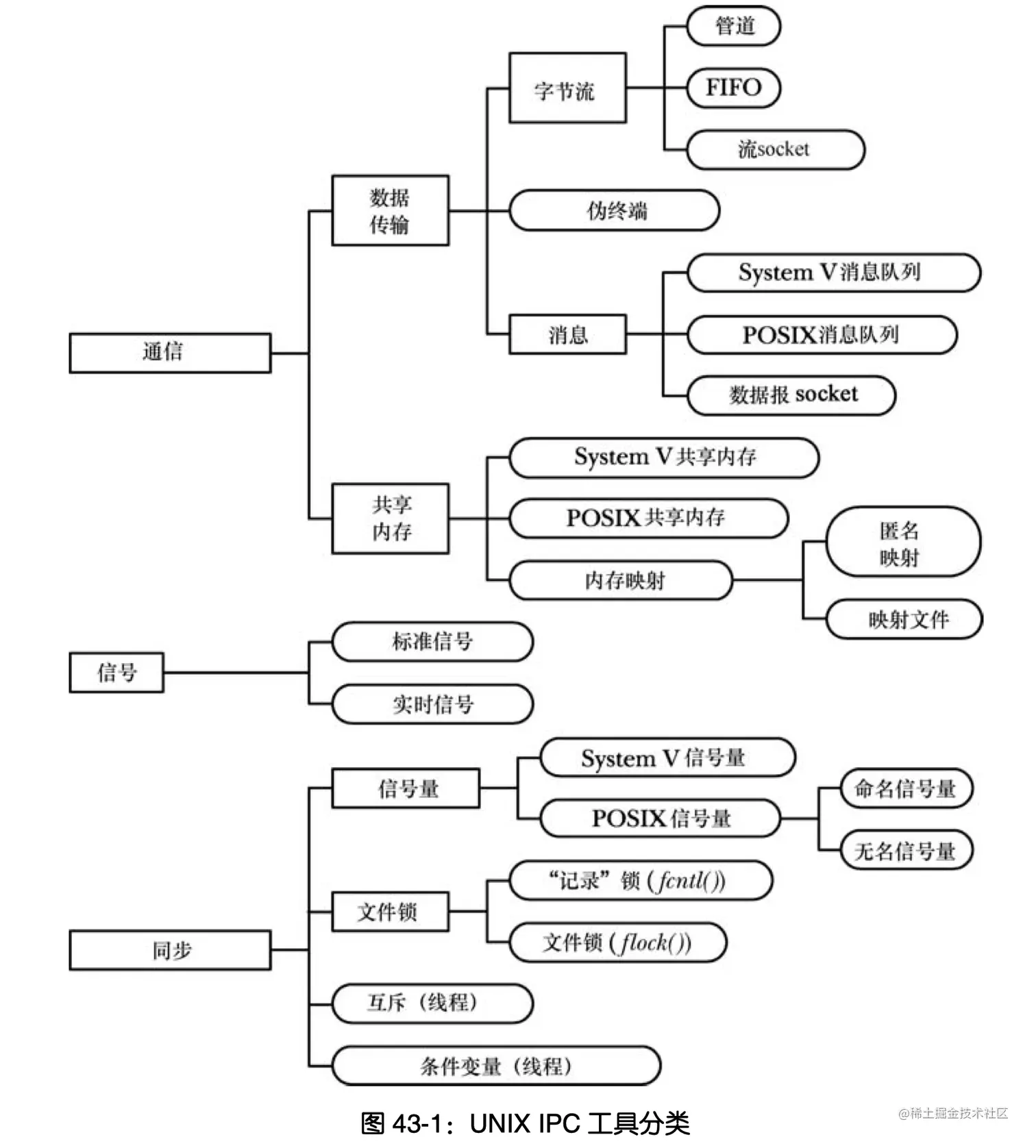 找了一下,进程间通信大概有下面这些类别:(参考《Linux/UNIX系统编程手册》 book.douban.com/subject/258… )
