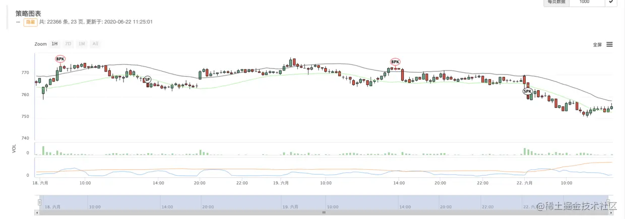 K线图表 根据策略回测、实盘页面设置的默认K线周期,策略会生成K线图表,并且根据策略编写内容,在K线图表上显示变量值曲线。例如例子中的图表:
