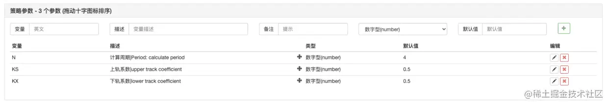 在策略编辑页面,给策略设置的参数,在策略代码中是可以直接使用的。麦语言的策略参数一般只用数值类型,其它类型例如:布尔类型、下拉框、字符串等并不常用。例如上例中N这个参数,默认值为4,如果创建机器人时没有修改这个参数,那么机器人运行起来以后,在策略中N的值即为4。