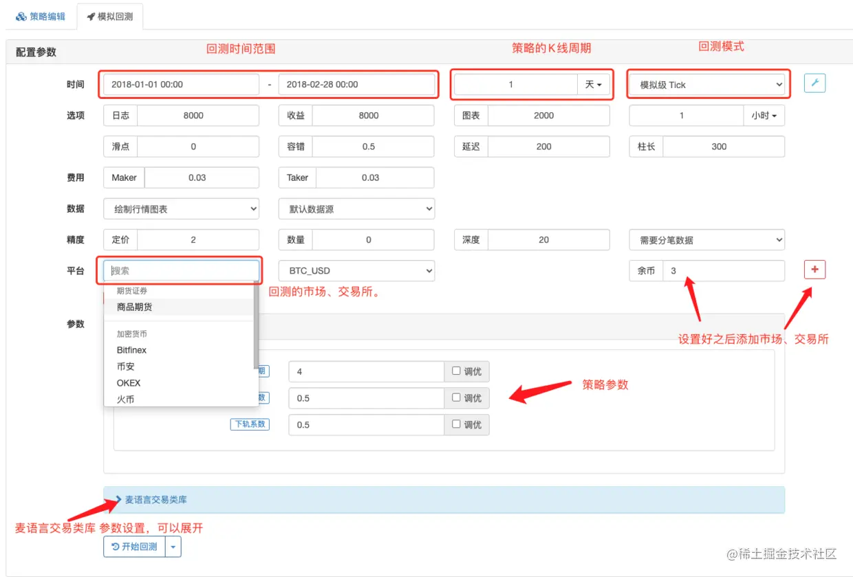 选定回测时间范围后(起始时间、结束时间),设置策略的K线周期,麦语言也支持策略中多K线周期数据。但是这里设置的K线周期是默认K线周期,这里设置为日K线,那么策略运行后自动生成的图表上就是日K线。回测模式分为「实盘级别」、「模拟级别」具体可以查询文档:www.fmz.com/digest-topi… 。然后选定要回测的市场或者交易所,添加之后就可以回测了,其它参数如果需要调整,例如初始回测资金数值等,可以具体根据需求设置,鼠标放在参数上有提示。