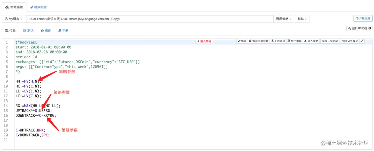 麦语言的策略参数和在发明者量化交易平台上的其它语言一样,在策略编辑页面设置,例如我们以麦语言版本的Dual Thrust策略为例。