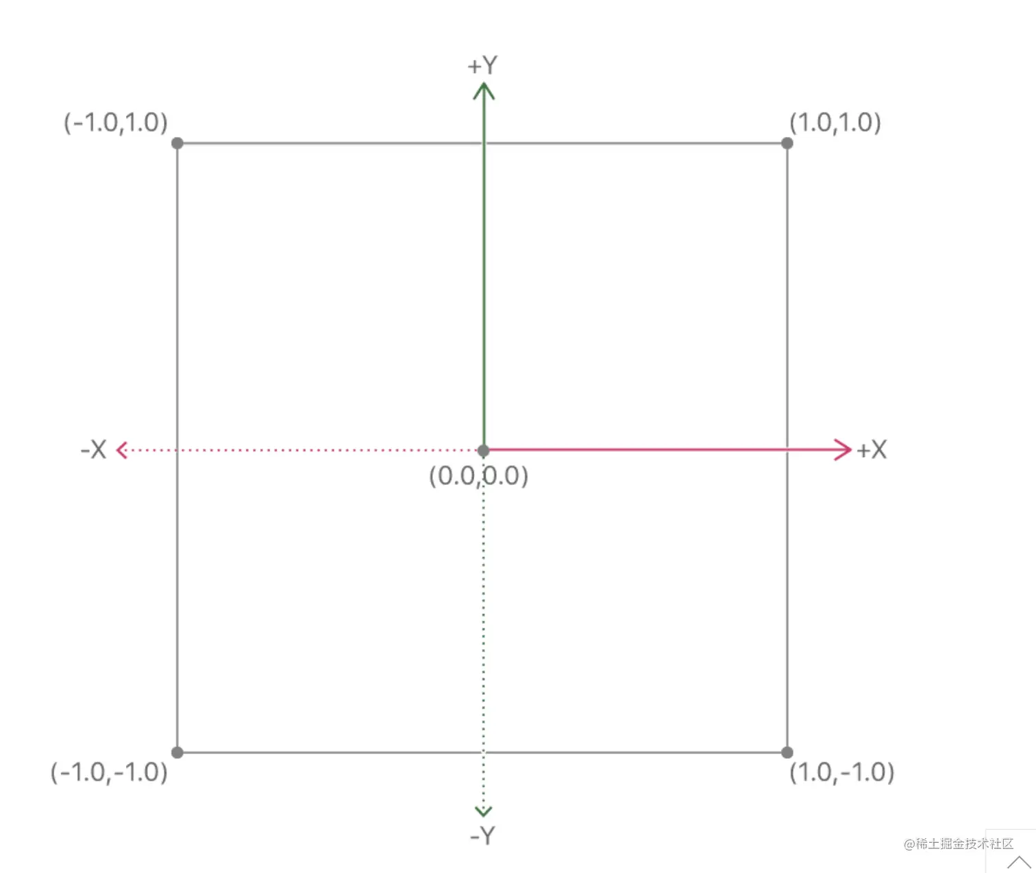 这里创建的坐标范围在[-1,1]之间,因为我们要将本地坐标转化为裁剪系坐标(Clip space)的坐标值。即将显示区域(目前是屏幕完整区域)映射到到 X:[-1, 1],y:[-1, 1] 所在的矩形区域内。