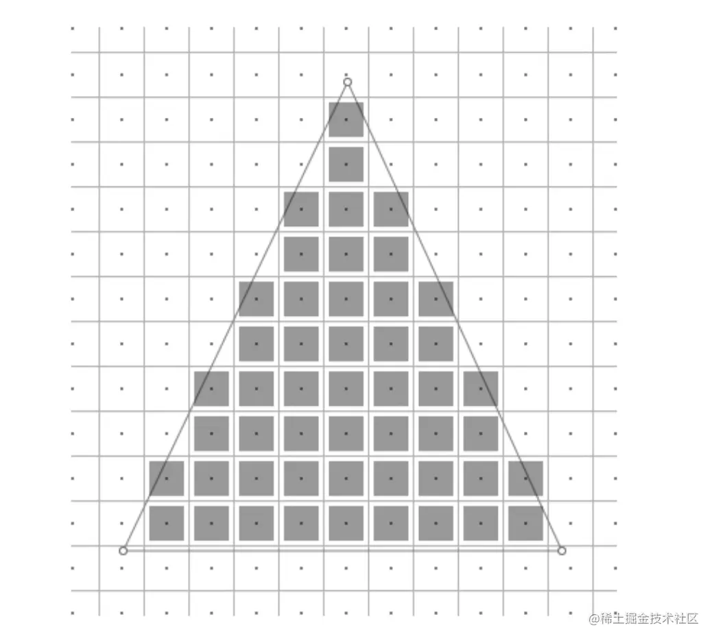 光栅化阶段,会把通过顶点绘制出来的图元,进行判断,拆分,筛选。保留下最终需要显示的像素点。 然后逐像素传入片段着色器。如下: