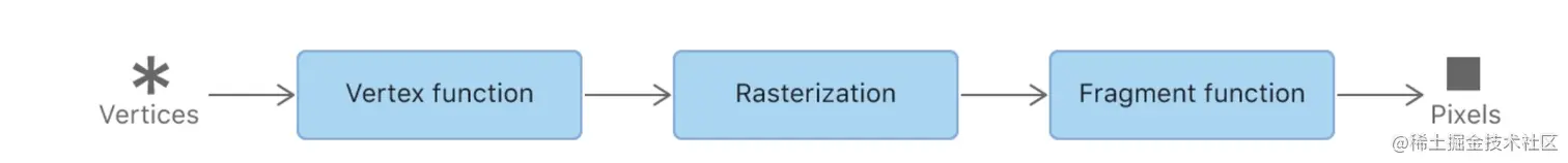 先来复习渲染管线,渲染管线可以理解成从顶点数据(Vertices)到屏幕显示的像素点(Pixels)的过程。