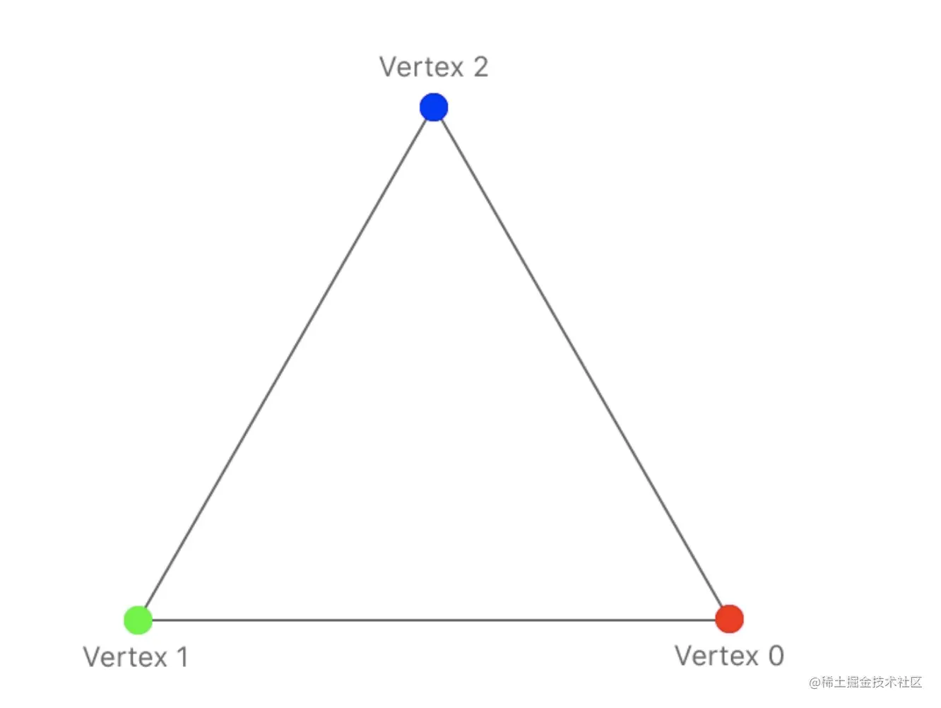 如图所示的,我们需要 3 个顶点来组成一个三角形,并以数组的形式传递这 3 个顶点作为图形渲染管线的输入,这个数组叫做顶点数据(Vertex Data),顶点数据是一系列顶点的集合。在这个例子里每个顶点只由一个位置和一个颜色值组成。