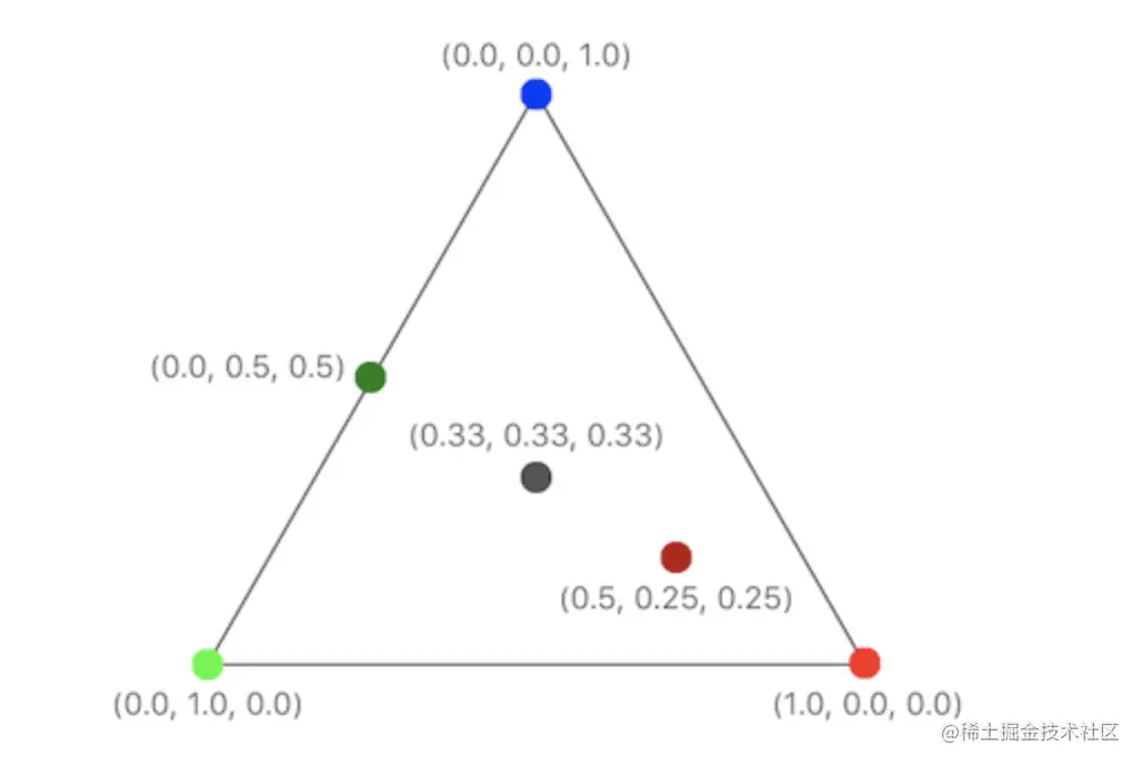 每个片段的坐标,色值,都会根据实际的位置,线性计算出。如下所示:
