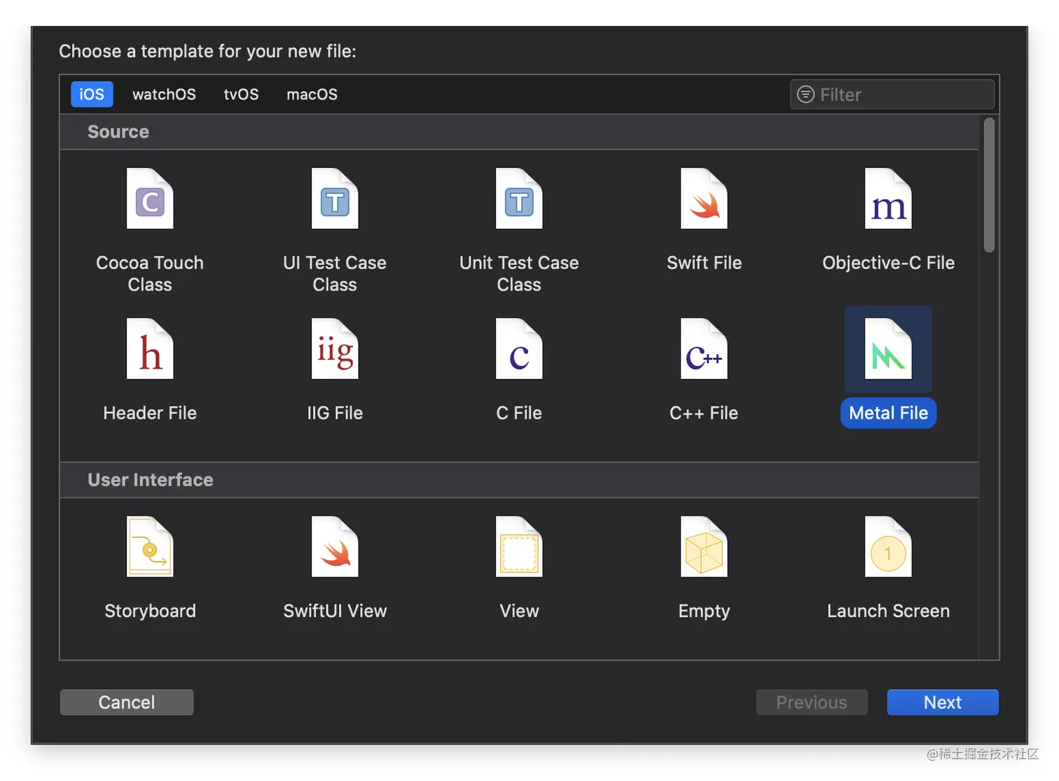 创建一个名为 Shaders的 .metal文件。顶点着色器和片段着色器的代码都写在这个文件里面。关于编写 Metal 着色器用到的语言,MSL(Metal Shading Language)将在后面的篇章中详细介绍。