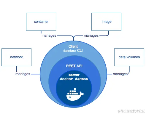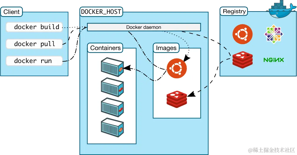注意:守护程序主要是创建和管理Docker对象,例如图像,容器,网络和卷。
