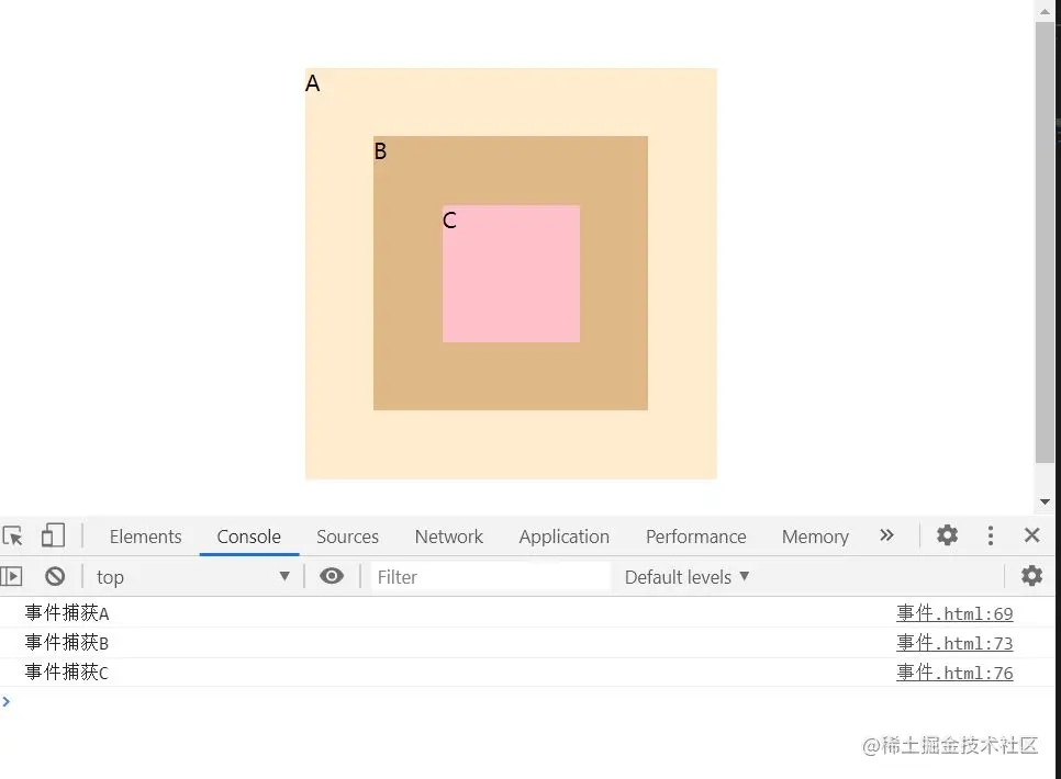 window.onload = function () { var a = document.querySelector(".a"); var b = document.querySelector(".b"); var c = document.querySelector(".c"); a.addEventListener("click", function () { console.log('事件捕获A'); }, true) b.addEventListener("click", function () { console.log('事件捕获B'); }, true) c.addEventListener("click", function () { console.log('事件捕获C'); }, true) }