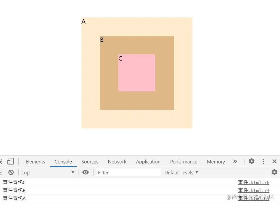 window.onload = function () { var a = document.getElementsByClassName("a")[0]; var b = document.getElementsByClassName("b")[0]; var c = document.getElementsByClassName("c")[0]; a.addEventListener("click", function () { console.log('事件冒泡A'); }) b.addEventListener("click", function () { console.log('事件冒泡B'); }) c.addEventListener("click", function () { console.log('事件冒泡C'); }) }