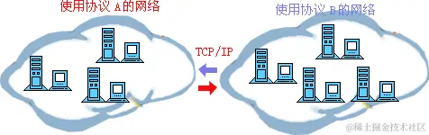 计算机网络协议同我们的语言一样,多种多样。而ARPA公司与1977年到1979年推出了一种名为ARPANET的网络协议受到了广泛的热捧,其中最主要的原因就是它推出了人尽皆知的TCP/IP标准网络协议。目前TCP/IP协议已经成为Internet中的“通用语言”,下图为不同计算机群之间利用TCP/IP进行通信的示意图。