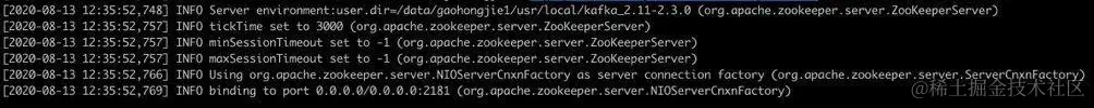 - 运行 zookeeper-server-start.sh $KAFKA_HOME/config/zookeeper.properties