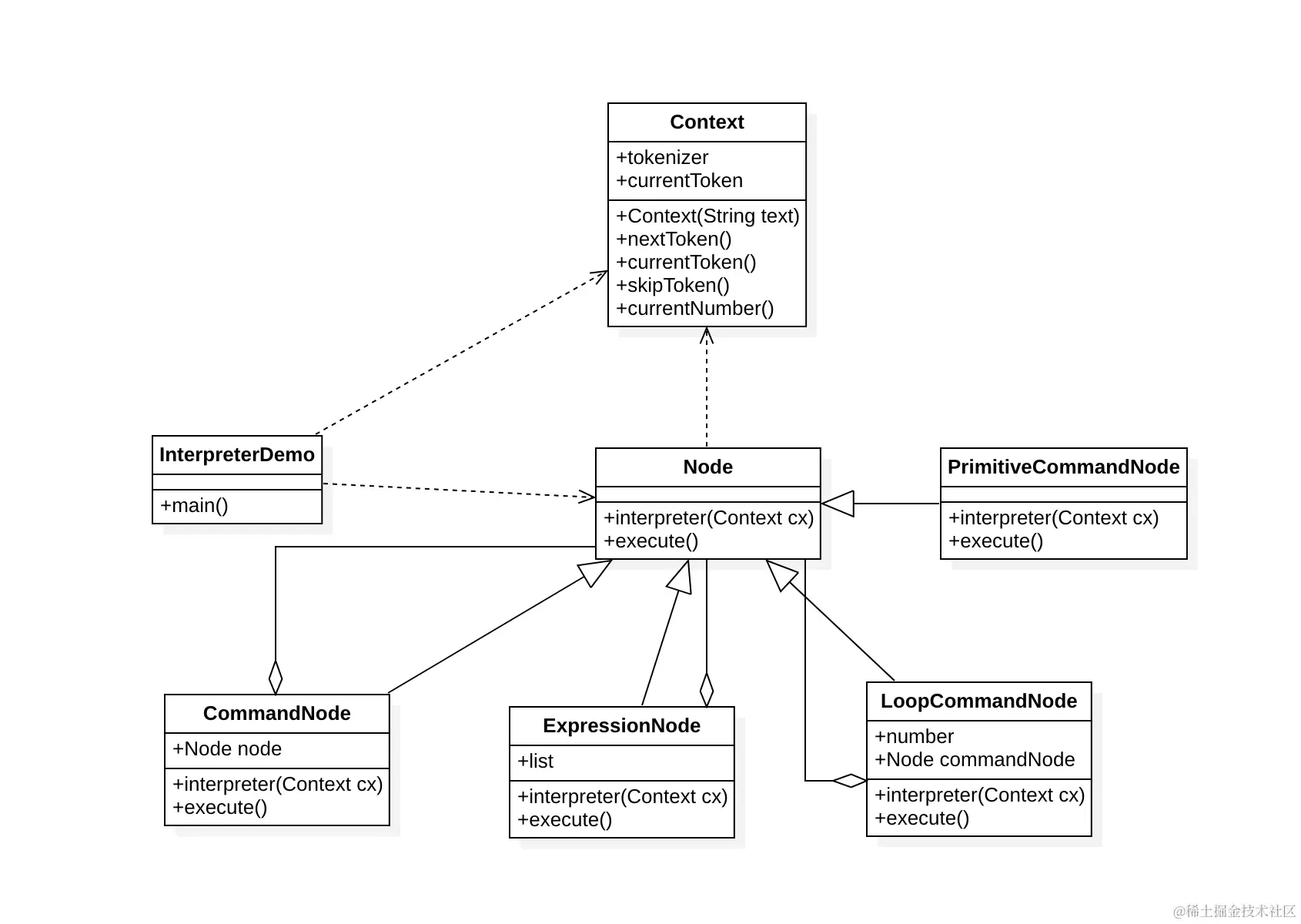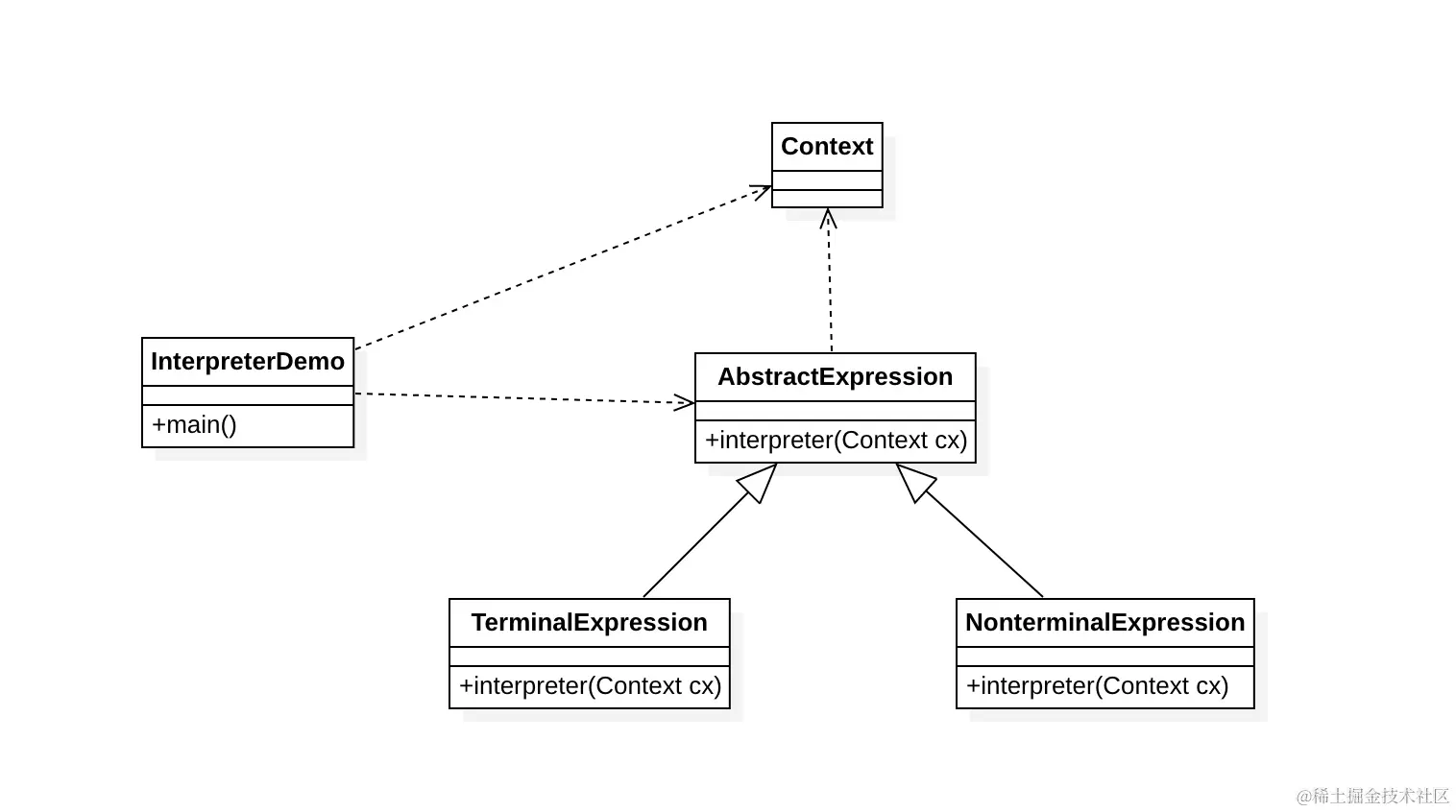 - 是抽象表达式的子类,用来实现文法中与终结符相关的操作,文法中的每一个终结符都有一个具体终结表达式与之相对应。