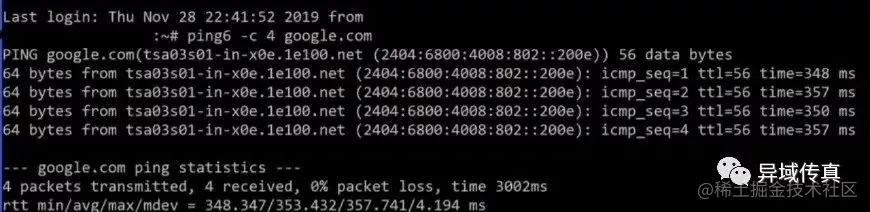 ping6 -c 4 google.com # google 可以直接使用 ipv6 进行访问