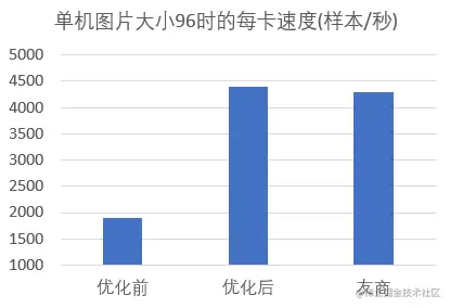 在单机训练速度方面,腾讯工程师主要解决了1.分布式系统中访问远端存储的数据较慢 2.大量线程相互抢占资源导致CPU效率低下 3.JPEG小图片解码制约性能等问题,提升了整体训练的速度。经过优化后,单机训练每卡速度有了明显提升,以96963图片大小为例,训练速度对比如下图所示: