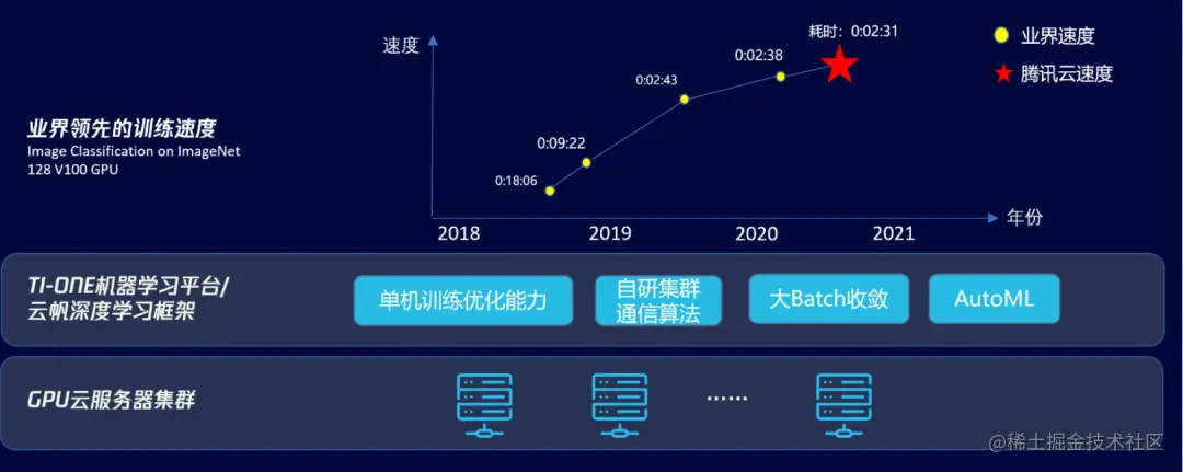 正是在这样的背景下,腾讯云联合腾讯机智团队、腾讯云智能钛团队、腾讯优图实验室、腾讯大数据团队和香港浸会大学计算机科学系褚晓文教授团队,以ImageNet为训练的标杆,研发出了Light大规模分布式多机多卡训练框架,这套全新的训练解决方案,在单机训练速度、多机多卡通讯优化、batch收敛等方面的多个细节上都进行了优化,可以让AI模型训练更加高效: