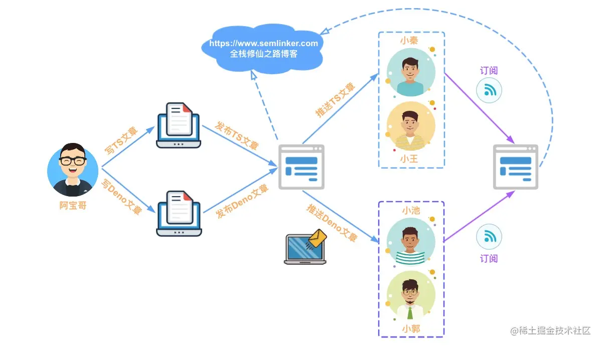 在了解他们的情况之后,阿宝哥突然想到了之前小秦与小王提的建议。因此,又是一顿 “操作” 之后,阿宝哥为了博客增加了专题订阅功能。该功能上线之后,阿宝哥及时联系了小池和小郭,邀请他们订阅 Deno 专题。之后小池和小郭也成为了阿宝哥博客的订阅者。现在的流程变成这样: