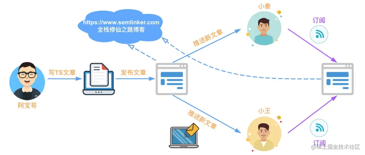 时间就这样过了半个月,小秦和小王都陆续找到了阿宝哥,说 “全栈修仙之路” 博客上的 TS 文章都差不多学完了,他们有空的时候都会到 “全栈修仙之路” 博客上查看是否有新发的 TS 文章。他们觉得这样挺麻烦的,看能不能在阿宝哥发完新的 TS 文章之后,主动通知他们。