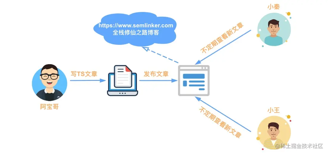 在第一个场景中,小秦和小王为了能查看阿宝哥新发的 TS 文章,他们需要不断地访问 “全栈修仙之路” 博客: