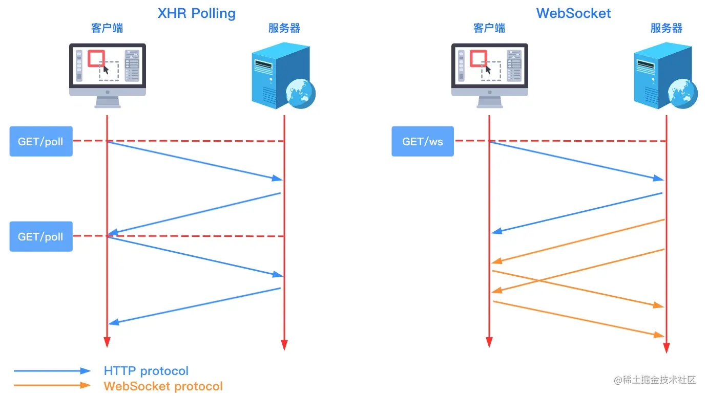 介绍完轮询和 WebSocket 的相关内容之后,接下来我们来看一下 XHR Polling 与 WebSocket 之间的区别: