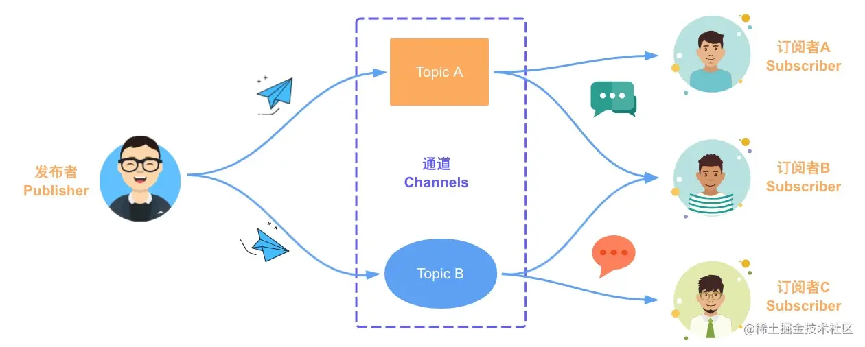 在发布订阅模式中有三个主要角色:Publisher(发布者)、 Channels(通道)和 Subscriber(订阅者)。
