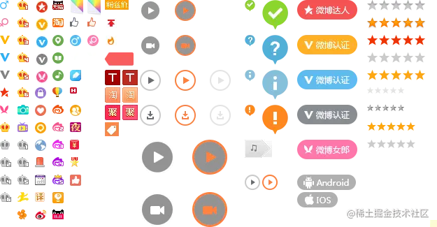 - SVG 图标,需要引入预先定义好图标的 SVG 文件,然后将具体的图标 use 出来即可,可以分别修改图标中不同部位的颜色。