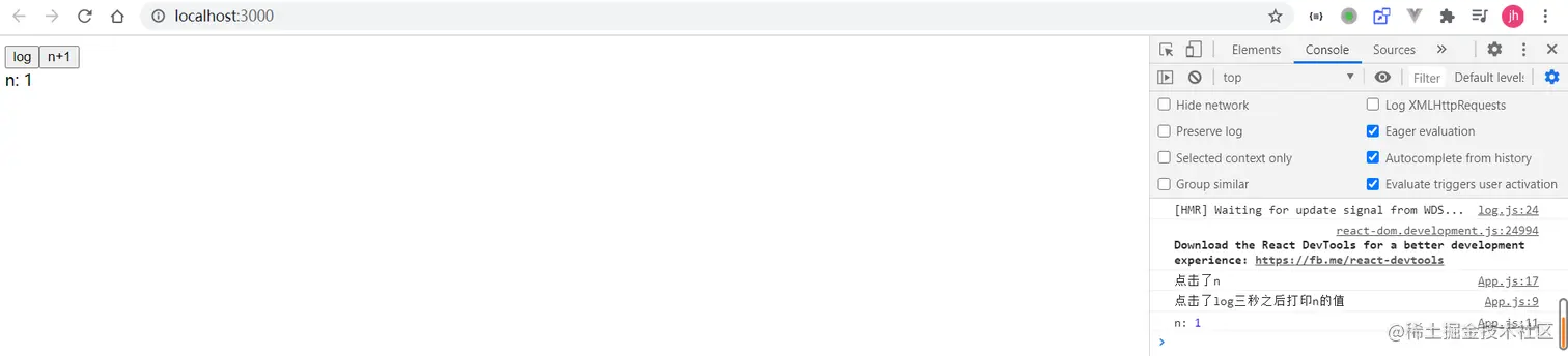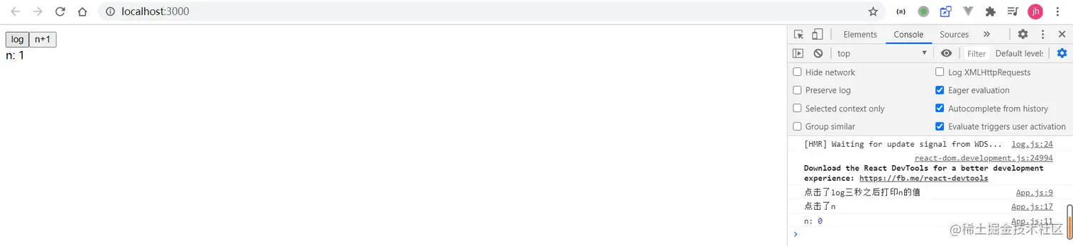 你的想当然不一定是对的,让我们通过代码来思考一下。页面提供了两个按钮,一个是将n+1一个是在三秒钟之后打印出n的值。
