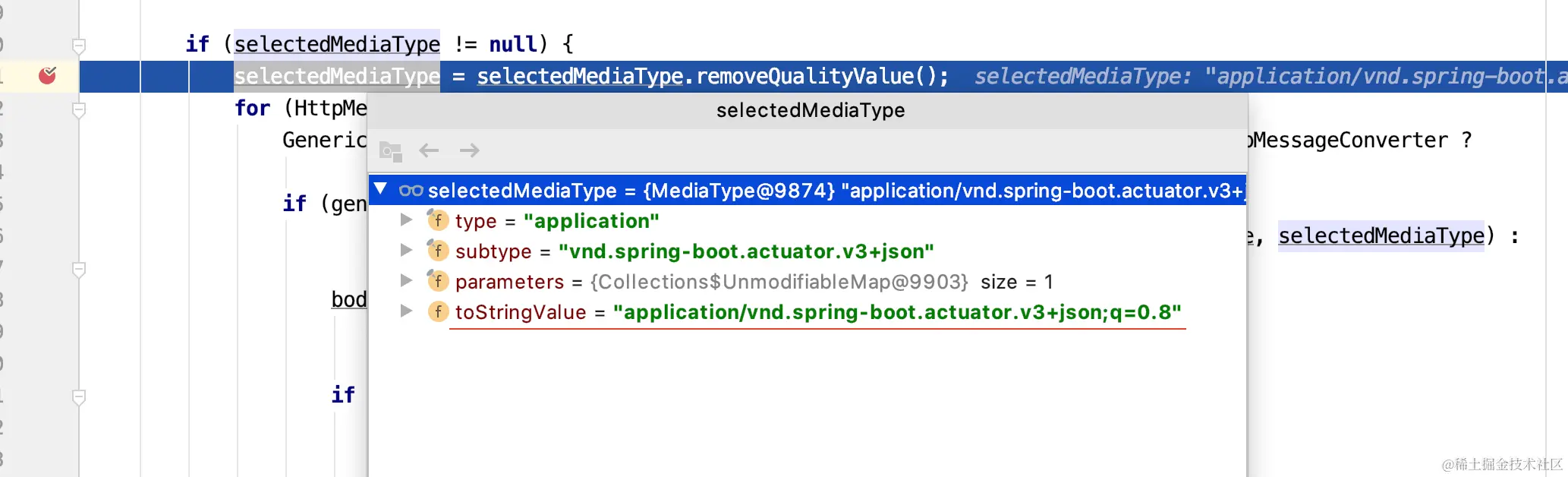 从图中可以看出,/actuator/health心跳接口响应的http数据包,请求头的Content-Type并非application/json,而是application/vnd.spring-boot.actuator.v3+json。