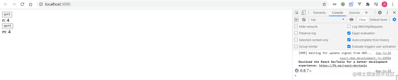 <button onClick={()=>setM(m+1);console.log('点击了m')}>+1</button>
