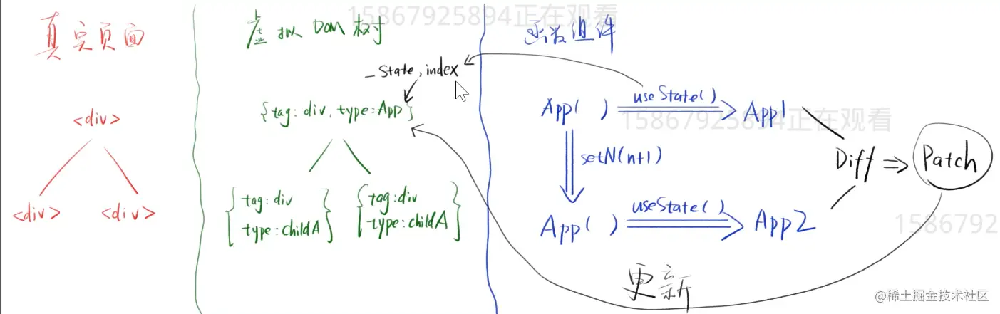 图中展示了首次执行App函数组件会通过useState将数组_state和索引index保存到返回的虚拟DOM中。当使用setN之后改变了n的值,React就会通过DOM Diff检测出变化,并使用Patch更新虚拟DOM树中的_state数组下标为index的值。