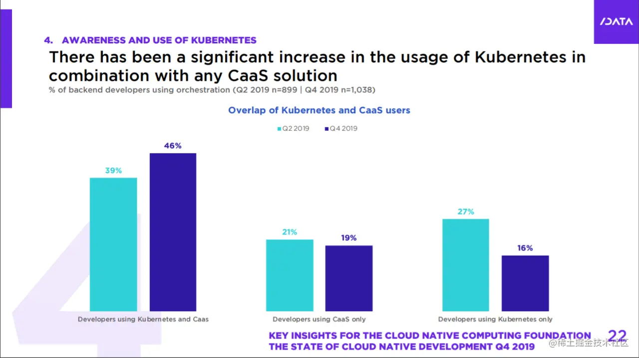 报告发现,在这些开发人员中,**接近50%的开发人员正在将 CaaS(容器)解决方案和kubernetes 结合使用。**仅使用 CaaS(容器)解决方案的占19%,仅使用 Kubernetes的占15%。与2019年第二季度相比,使用 Kubernetes 和 CaaS 产品的开发人员比例显着增加,而专门使用 Kubernetes 的开发人员数量则显着减少。