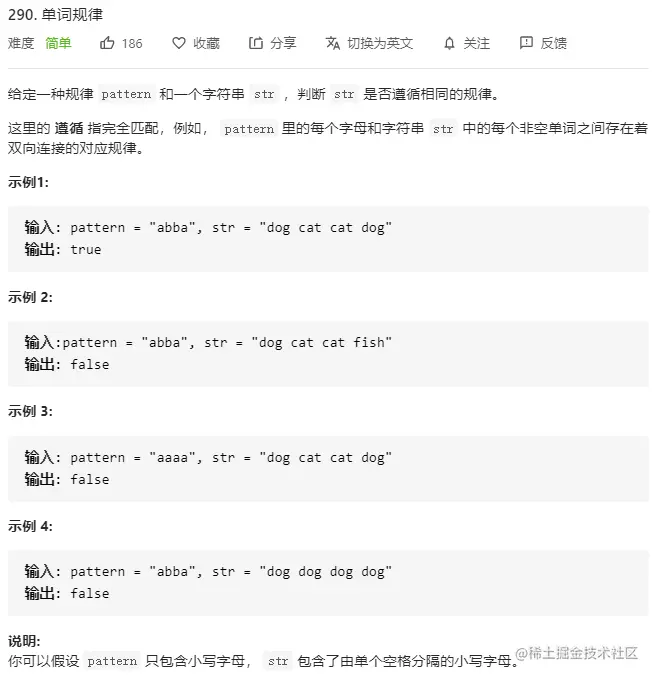 然后检查两个哈希表中的记录,比如某个字母之前已经映射到某个单词,但存在和这个映射矛盾的映射(字母映射到别的单词), 或者是存在某个矛盾的从单词到字母的映射,就返回false。