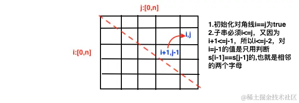 3.状态转移:i表示子串起点,j表示终点,f[i][j]就是[i,j]是否为回文串:f[i][j]=f[i+1][j-1]&&s[i-1]==s[j-1],但需要判断边界情况